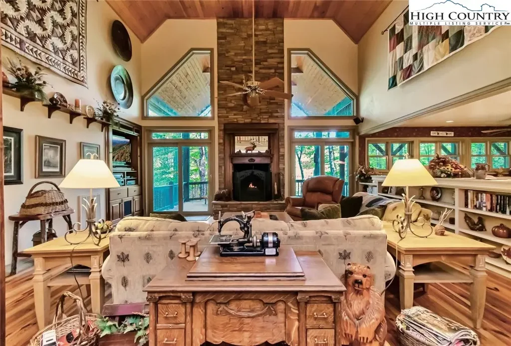 Seller is ready to make a deal with another $50,000 price cut on this rare find in the heart of Banner Elk! A custom-built 3,545 sq. ft. four bedroom home with mountain view and lush landscaping, situated in the prestigious Crooked Creek community. Now an amazing $245 per square foot for a solidly built spacious mountain retreat. The covered 714 sq. ft. main level observation deck features a stacked stone wood-burning fireplace, perfect for gatherings. Enjoy tranquility among the rhododendrons and evergreens that frame views of Beech Mountain. A second wood-burning fireplace serves the great room, which boasts a vaulted T&G ceiling and stunning heart pine flooring. The kitchen includes a commercial-grade gas cooktop and generous counter space. The spacious dining area adjoins. The covered side deck offers additional dining space. A half bath is located off the entry foyer. The main floor bedroom is large enough to serve as a second primary suite. The upper level offers dual bedroom suites, separated by a huge balcony overlooking the great room. A spacious laundry room is located off the balcony. The primary suite has a 378 sq. ft. sun deck. Its large bath includes a tiled rain shower and separate clawfoot soaking tub. The 4th bedroom suite on the lower level is currently used as family/office space. It features a gas log fireplace and adjacent game /flex room. A two-car radiant heated garage and utility/workroom (654 sq. ft.) adjoin this living space. Upper floors have central gas heating. A whole house fan pulls out the warmth and draws in cool mountain air - seldom used because the home was built on the cool north side of the mountain. The POA fee is $275 yearly; 30-day minimum rentals are permitted. Centrally located between Sugar and Beech Mountain ski resorts, Crooked Creek is minutes from trendy shops and eateries as well as outdoor music and indoor drama venues. The Blue Ridge Parkway, Boone, Blowing Rock and numerous golf courses are nearby. This custom home is sold turn-key except for contents of the upper level primary suite, framed art, family photos, an antique sewing machine in living area, Churchill books in living area, knife butcher block set and the lower level desk, filing cabinet and helicopter replica. All other closet contents and miscellaneous will be removed at buyer's request.